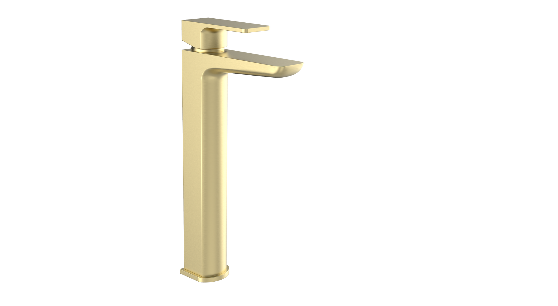 A tall brushed brass basin mixer with refined styling. Ideal for pairing with countertop basins for a statement finish.