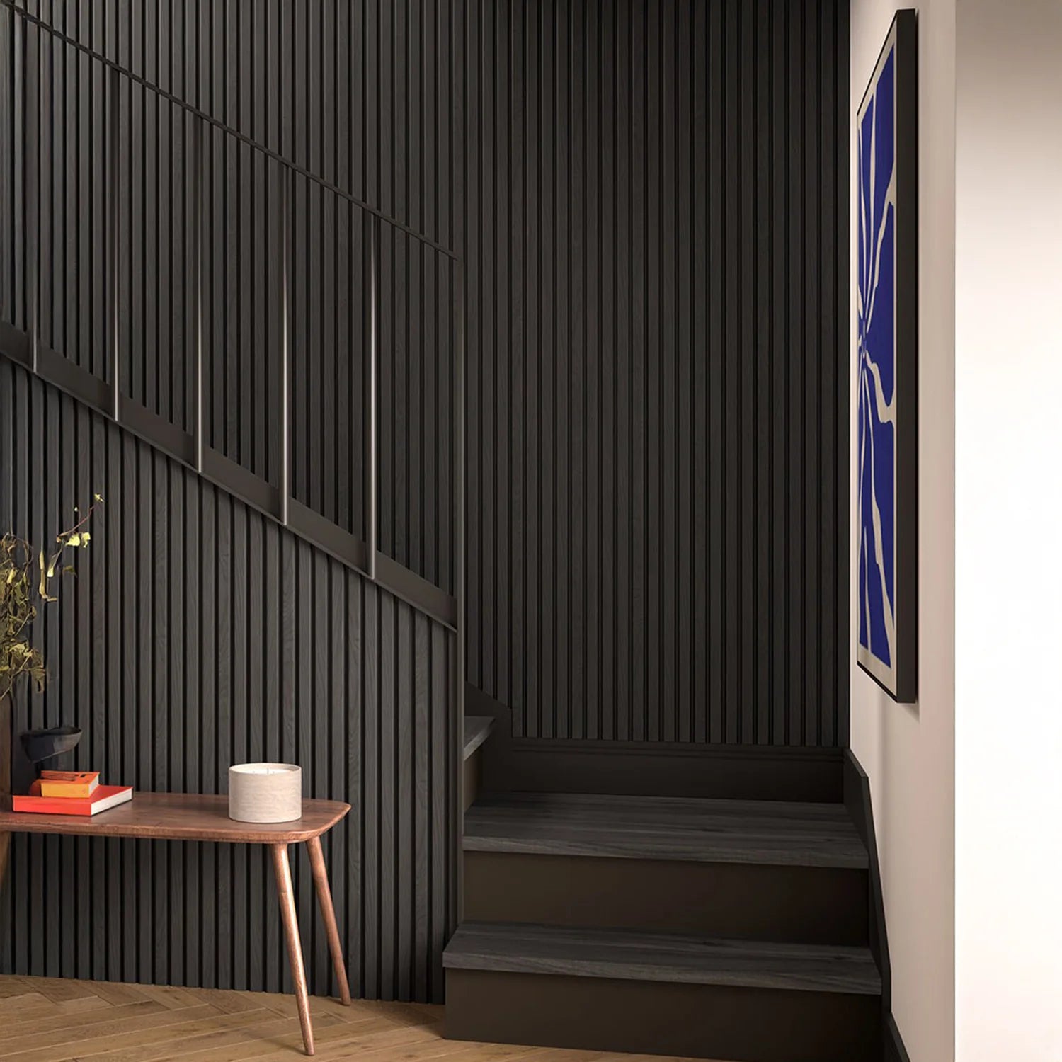 For a stunning splashproof space, opt for SlatWall Waterproof Charcoal panelling. This style features a black wood effect and our signature slatted structure, providing a dose of drama that gives rooms a luxurious look. Transforming walls with shadowy depth, this sleek contemporary profile features a grained texture for a tactile finish.